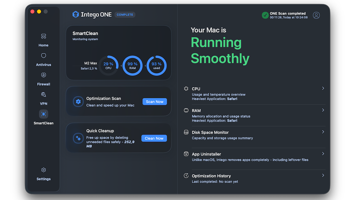 Intego ONE est à notre avis le meilleur antivirus pour Mac car il assure une sécurité de haut-niveau sans ralentir l'ordinateur tout en restant abordable. Cette version Complete clôt véritablement le triptyque de sécurité : antivirus, pare-feu et VPN avec le VPN avec l'antivirus qui protège votre Mac des attaques locales, le pare-feu qui bloque les connexions réseau indésirables et le VPN qui sécurise celles que vous autorisez quand même. D'autres formules plus abordables existent avec Essentiel qui se contente de l'antivirus et du pare-feu ou bien Advanced qui rajoute le nettoyeur de fichiers SmartClean à ces derniers.