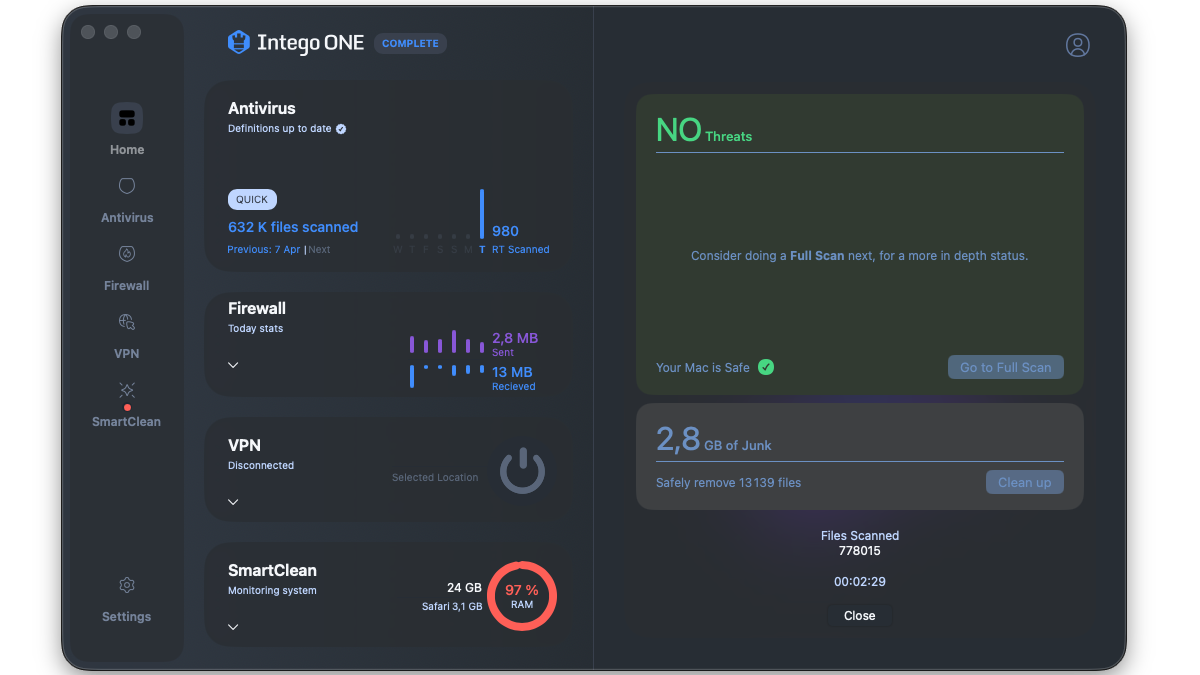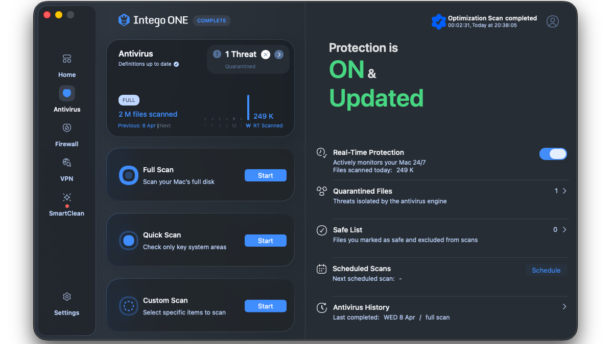 Intego renouvelle ainsi entièrement sa suite dédiée à la protection de votre Mac. Intego ONE est maintenant une application tout-en-un qui comprend les trois remparts de la sécurité : l'antivirus historique pour lutter contre les menaces locales (virus, malwares, etc.) qui infectent votre Mac, le pare-feu pour empêcher toute menace en ligne (hacker, pirate) de pénétrer sur votre machine ou de bloquer tout spyware qui enverrait vos données confidentielles, et le VPN qui sécurise les connexions que vous avez finalement autorisées tout en vous garantissant anonymat en confidentialité en ligne. Intego est donc le seul éditeur reconnu sur Mac à proposer ce tryptique complet de la sécurité numérique : antivirus, pare-feu, VPN. Il est aussi le seul à avoir cette expérience et cette connaissance uniques avec macOS qui se reflète dans les excellents résultats obtenus dans les tests indépendants, faisant de lui le meilleur antivirus pour Mac, tout simplement.