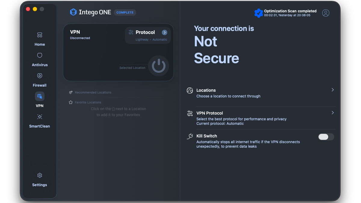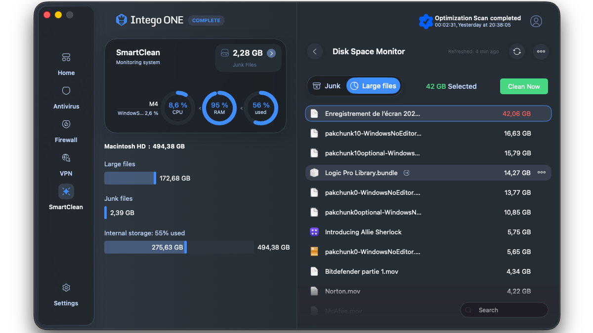 Intego ONE est à notre avis le meilleur antivirus pour Mac car il assure une sécurité de haut-niveau sans ralentir l'ordinateur tout en restant abordable. Il existe plusieurs formules avec Essentiel qui se contente de l'antivirus et du pare-feu ou Complete qui clôt le triptyque de sécurité : antivirus, pare-feu et VPN avec le VPN avec l'antivirus qui protège votre Mac des attaques locales, le pare-feu qui bloque les connexions réseau indésirables et le VPN qui sécurise celles que vous autorisez quand même.